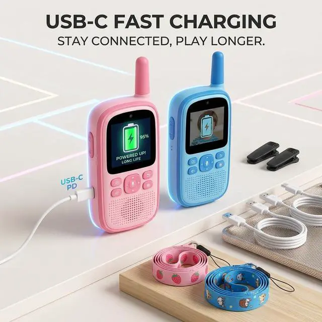 Compact and portableEach children's walkie talkie weighs only 63 grams, suitable for children's use. These walkie talkies are equipped with USB-C rechargeable batteries and simple push to talk buttons, making them suitable for indoor and outdoor exploration activities such as shopping, spring outings, and summer camps. This is an ideal birthday Christmas gift and outdoor toy for children aged 3-12