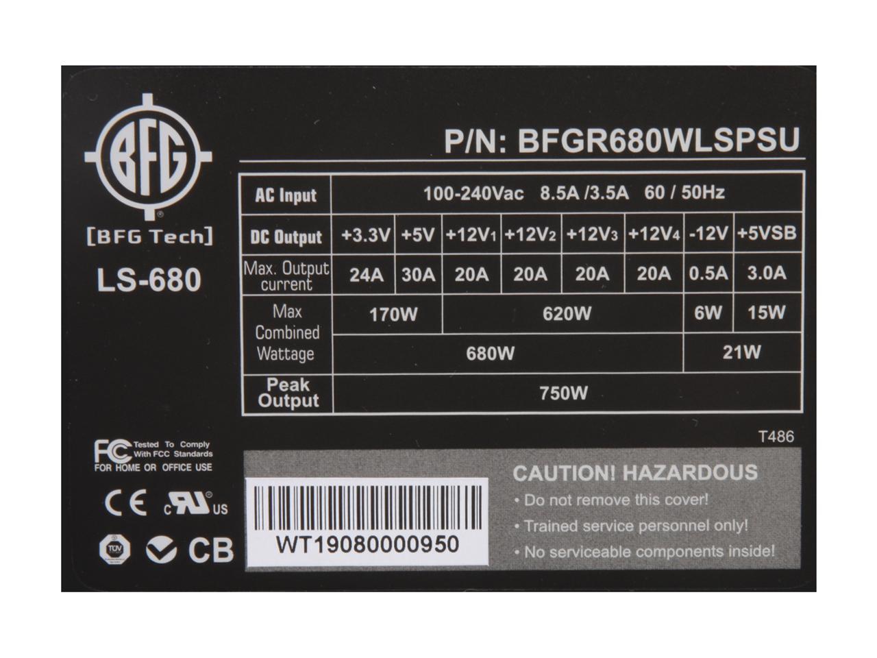 BFG Tech LS SERIES LS-680 680W Continuous @ 40°C ATX12V 2.2 / EPS12V 2.8 SLI Certified CrossFire Ready 80 PLUS Certified Active PFC Power Supply
