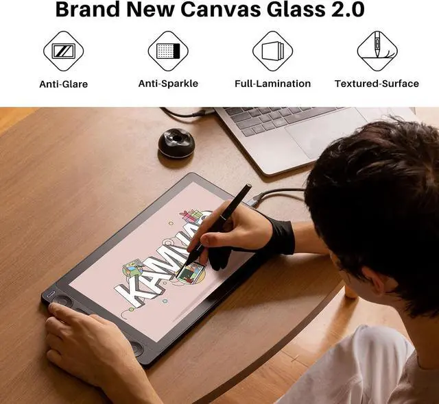 All-New Canvas Full-laminated Glass: The Kamvas 13 (Gen 3) art tablet features upgraded anti-glare Canvas Glass 2.0 with nano-etching tech that reduces glare, sparkle and image noise while enhancing clarity. The paper-textured surface and full lamination offer natural drawing feel and better immersion.