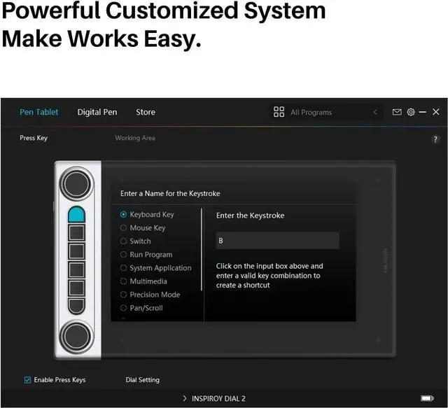All the dials and press keys can be customized to your desired shortcuts of keyboards or mouse in Huion Driver to meet the operating needs of various software. You can program different shortcuts for different software which allows up to 12 different functions per software. And the custom settings can be named, imported and exported.
