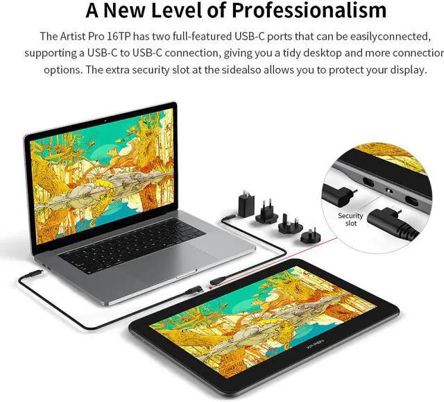 Supporting up to 60 degrees of tilt action and with 8192 pressure sensitivity levels allows you to create exquisite lines and seamless shading. A New Level of Professionalism The Artist Pro 16TP has two full-featured USB-C ports that can be easily connected, supporting a USB-C to USB-C connection, giving you a tidy desktop and more connection options. The extra security slot at the side also allows you to protect your display. Some old model laptops or desktops need to be connected via an HDMI cable. Supports USB-C DC 5V/300mA output, allowing for easy connection to Nintendo Switch.