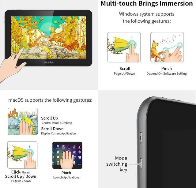 4K Ultimate Visual Experience With 4K resolution (3840 x 2160), the XP-PEN Artist Pro 16TP introduces you to a whole new world of visual detail and clarity. It will bring all your creations to life like never before! The Most Natural Colors With 92% Adobe RGB, 124% sRGB in color gamut and a 1000:1 contrast ratio, the XP-PEN Artist Pro 16TP delivers natural color transition, super color accuracy and saturation. Multi-touch Brings Immersion In Windows, the Artist Pro 16TP features a perfect combination of multi-touch control and pen function. You can easily zoom in and out, rotate your canvas and navigate more freely with your fingers while drawing with a stylus.