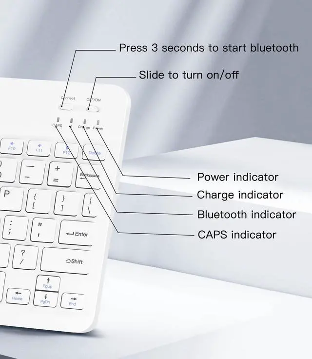 Bluetooth 3.0 Keyboard and Easy Operation: The working distance of our keyboard up to 33 ft. The keyboard is designed with a separate off/on slider and bluetooth connect button and corresponding indicators. Press the "fn" "Android" or "win" or "iOS" on the keyboard simultaneously will quickly switch between the three modes