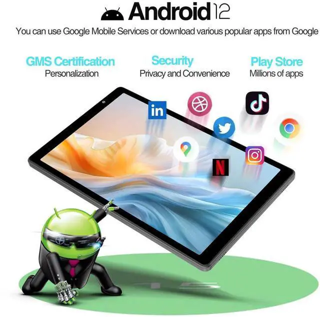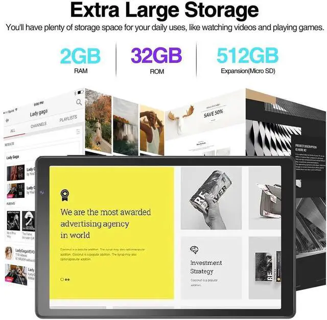 10 inch android tablet comes with the Android 10 go, 32 GB ROM, makes it more convenient to run app or store files, songs, pictures, videos and more games. In addition, 10 inch tablet includes a TF card slot ( 1TB expandble, NOT included)