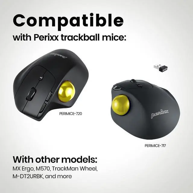 A replacement trackball for your trackball mouse with a 1.34-inch diameter. The ball was made of high-quality material designed for major mouse brands in the market. Fits to trackball devices below: PERIMICE-517, PERIMICE-717, PERIMICE-520, PERIMICE-720,MX Ergo, M570, Cordless, TrackMan Wheel (not include Trackman Marble), M-DT2URBK, MA-WTB43BK, and more. Specifications: Diameter: 1.34-inch (34 mm) Weight: 0.06 lb (0.03 kg) Color: Glossy Yellow.