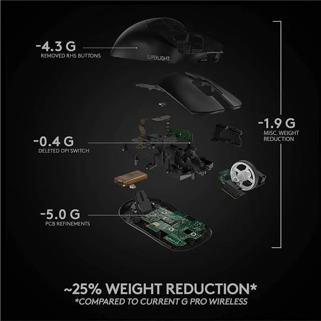 Tour lightest, fastest PRO mouse ever. Powered by LIGHTSPEED, its here to help you remove all obstacles, so you can focus on nothing but winning. Get insanely precise, fast, and consistent control with HERO Sensor. Take first faster with zero-additive PTFE feet that deliver a dramatically smoother glide. PRO X SUPERLIGHT weighs less than 63 g without the need for ridiculous holes. Developed in collaboration with a large group of the worlds best esports pros, PRO X SUPERLIGHT features hyper-minimal design, but is packed with our latest technologies and advancements.