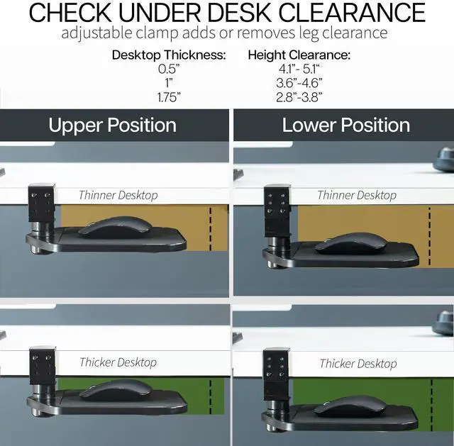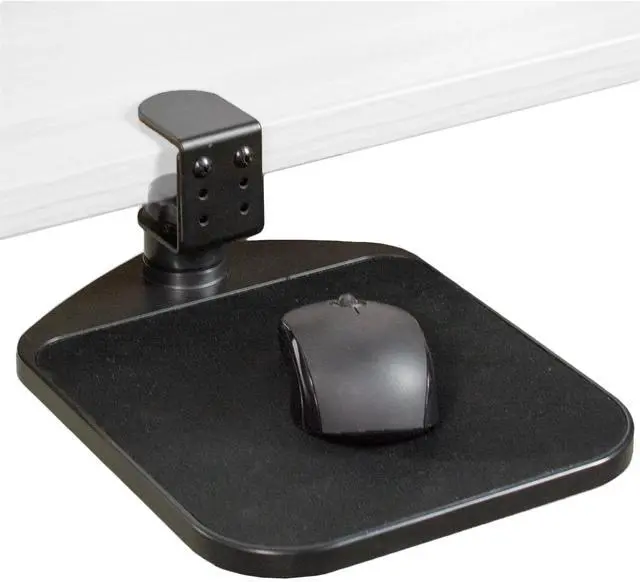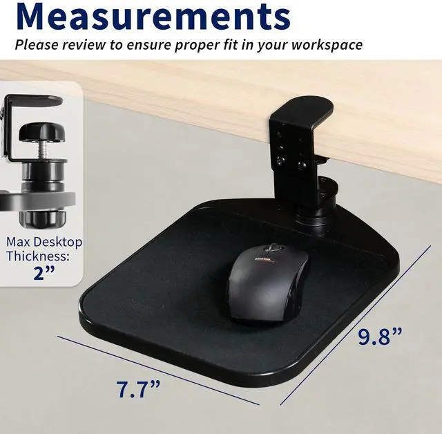 Click away in comfort with Desk Clamp Mouse Pad (MOUNT-MS01A) from VIVO! This adjustable 9.8" x 7.7" platform creates ergonomic angles for your wrist and provides additional space for your mouse and other small items. Elegant black fabric lines the top surface for optimal comfort and traction. The sturdy desk clamp attaches to any surface up to 2" in thickness for versatile placement, fitting regular office desks, tabletop risers, and more. The clamp also makes it easy to mount and unmount the mouse pad with no damage to your existing desk. Designed for both right-handed and left-handed users, this product accommodates your dominant hand with ease. Full 360° rotation means flexible placement for your wrist, as well as easy storage by rotating the tray under the desk surface when not in use. Minimal assembly is required out of the box, and all necessary hardware and instructions are provided to get your new mouse pad improving work processes in no time!
