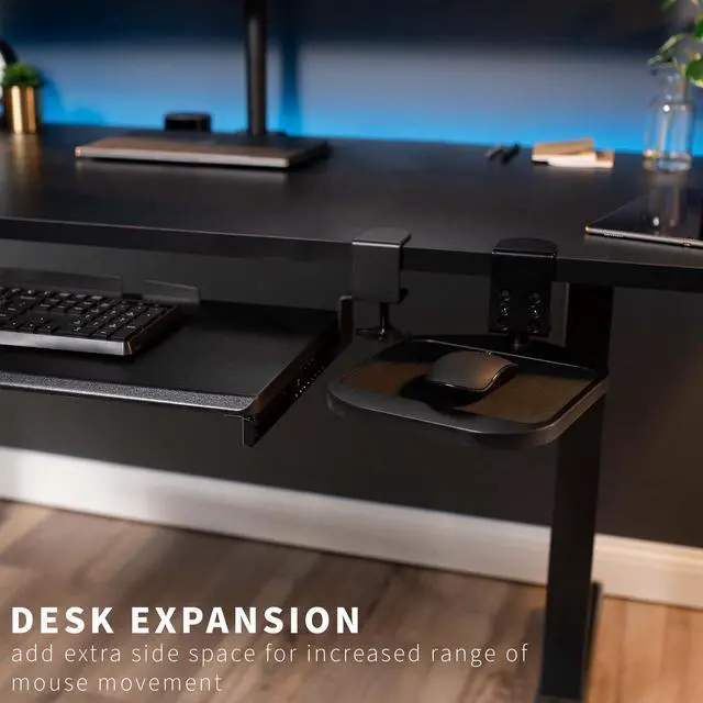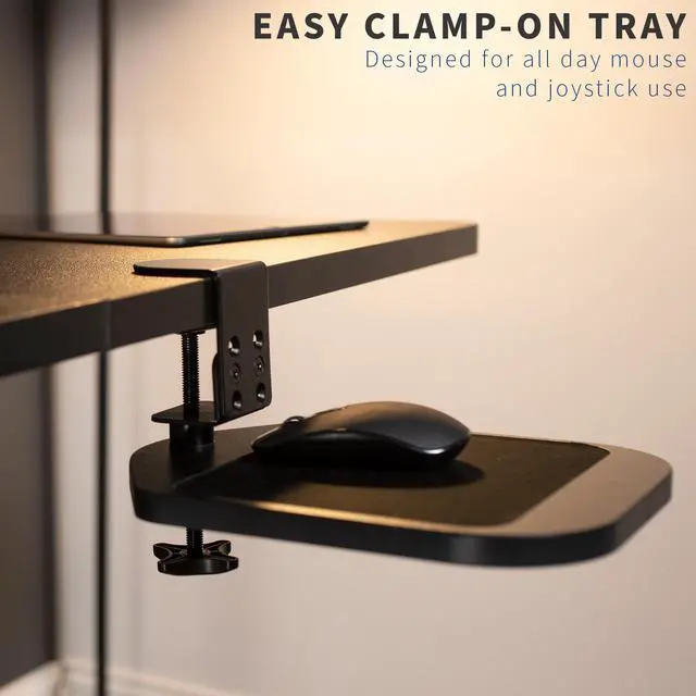 Click away in comfort with Wooden Clamp-on Mouse Pad (MOUNT-MS01B) from VIVO! This adjustable platform creates ergonomic angles for your wrist and provides additional space for your mouse and other small items. Elegant black fabric lines the top surface for optimal comfort and traction. The sturdy desk clamp attaches to any surface up to 2 in thickness for versatile placement, fitting regular office desks, tabletop risers, and more. The clamp also makes it easy to mount and unmount the mouse pad with no damage to your existing desk. Designed for both right-handed and left-handed users, this product accommodates your dominant hand with ease. Full 360° rotation means flexible placement for your wrist, as well as easy storage by rotating the tray under the desk surface when not in use. Minimal assembly is required out of the box, and all necessary hardware and instructions are provided to get your new mouse pad improving work processes in no time!