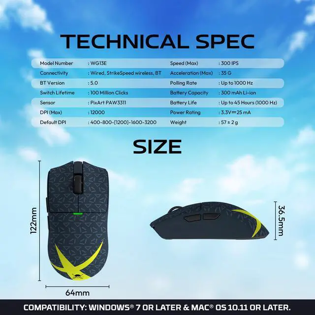 Model Number : WG13EConnectivity : Wired, StrikeSpeed wireless, BTBT Version : 5.0Switch Lifetime : 100 Million ClicksSensor : PixArt PAW3311DPI (Max) : 12000Default DPI : 400-800-[1200]-1600-3200Speed (Max) : 300 IPSAcceleration (Max) : 35 GPolling Rate : Up to 1000 HzBattery Capacity : 300 mAh Li-ionBattery Life : Up to 45 Hours (1000 Hz)Power Rating : 3.3V==25 mAWeight : 57 ± 2 g