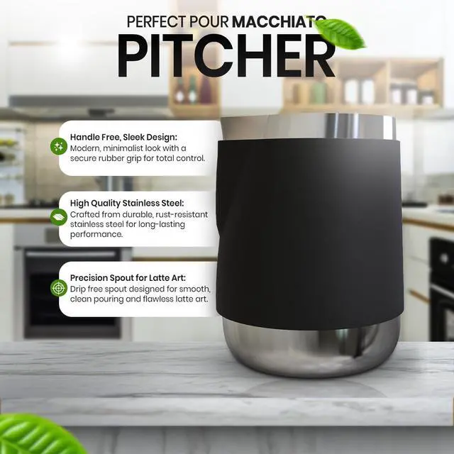 - : The pitcher is designed without a traditional handle. This pitcher features a secure rubber grip that insulates your hand from heat. The wrap provides a steady, slip-free hold, giving baristas precise control while steaming milk or pouring designs.