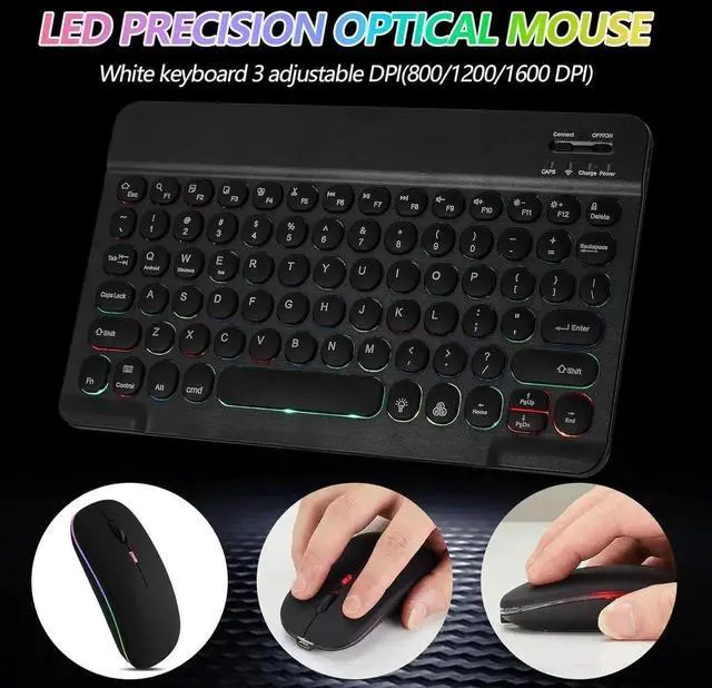 7-Color LED Backlit - This wiressless 7-color led backlit bluetooth keyboard and mouse adopts bluetooth wireless connection and scissor key structure,which bring you a perfect input experience,it has built in rechargeable polymeric lithium better and charging indicator,the keyboard will enter into sleeping mode if there is no action in 10 minutes,therefor it has a small comsumption and long battery life.