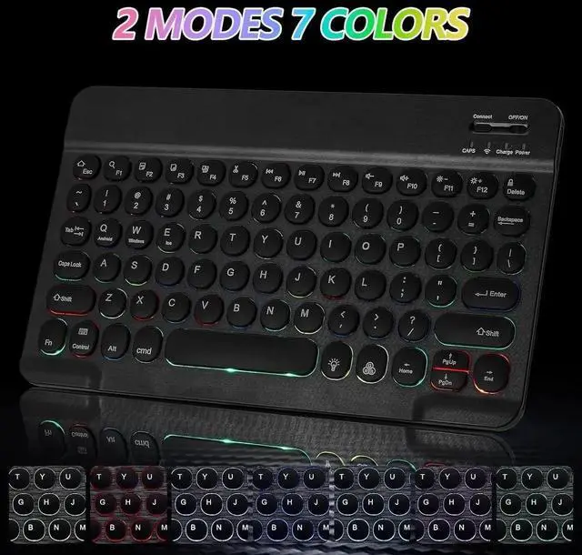 7-Color LED Backlit - This wiressless 7-color led backlit bluetooth keyboard and mouse adopts bluetooth wireless connection and scissor key structure,which bring you a perfect input experience,it has built in rechargeable polymeric lithium better and charging indicator,the keyboard will enter into sleeping mode if there is no action in 10 minutes,therefor it has a small comsumption and long battery life.