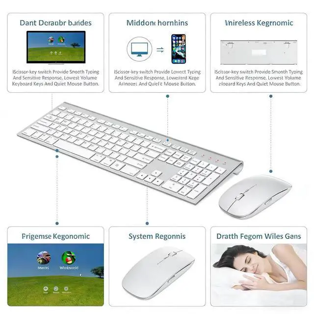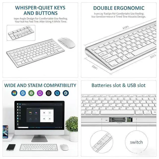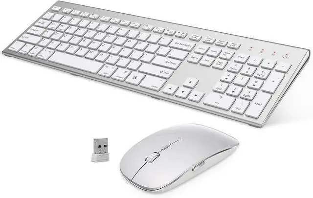 Slim and Ergonomic Wireless Keyboard : The slim wireless keyboard has a tilt angle for the great typing position.Sweat-resistant, skin-friendly finish wireless mouse in contoured shape would provide hours of work comfortably. The compact full-size keyboard type fast with numeric keypad and instant access your music,internet,e-mail,volume,etc by multi-media hot keys.(The hot-keys not fully