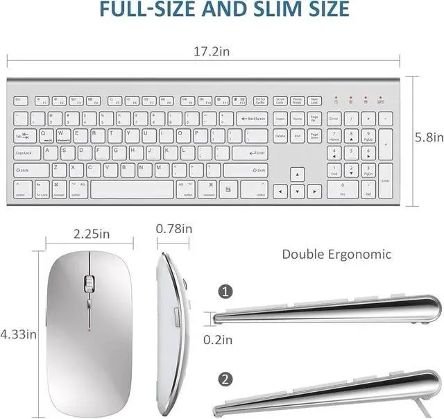 ONE USB for Keyboard and Mouse:The keyboard and mouse set using only 1 USB receiver, Stable 2.4GHz wireless provides a powerful, reliable connection up to 33ft without any lags.The wireless keyboard is designed in full size with number pad, which makes you more comfortable when using the keyboard; The compacte size provide a clean desktop,look likes more stylish