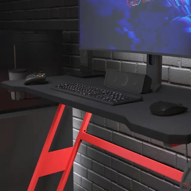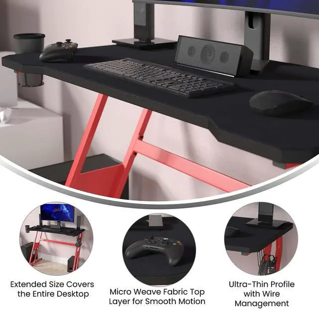 Always have plenty of room on your office desk or gaming table to move your mouse where you need it with this extra large mouse pad that covers your entire desktop. Large enough to fit a regular or gaming mouse, full size keyboard, and other desk items, this mega size mouse pad is ideal for your gaming or work space. Boasting a micro weave cloth surface cover that strikes the perfect balance between glide and control and a non-slip rubber base that keeps this extended mousepad in place, your days of using a standard mouse pad are over. This pad was designed with custom cutouts and dual wire management holes to fit our ergonomic "Z" shaped gaming desk with cup holder and headphone hook. Easy to wipe clean and great for preventing damage to your desktop, this oversized desk pad will make you wonder how you ever did without it.