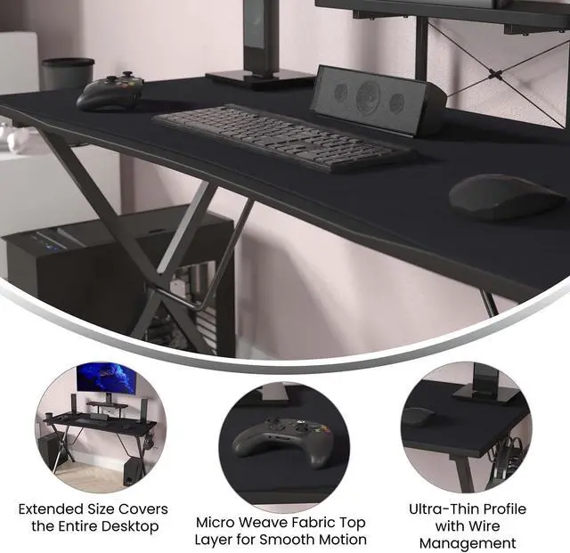 Move your mouse anywhere you need it smoothly and quickly with this extra large mouse pad that covers your entire desktop. Large enough to fit a regular or gaming mouse, full size keyboard, and other desk items, this mega size mouse pad is ideal for your gaming or work space. Boasting a micro weave cloth surface cover that strikes the perfect balance between glide and control and a non-slip rubber base that keeps this extended mousepad in place, your days of using a standard mouse pad are over. This pad was designed with custom cutouts to fit our gaming desk with cup holder and headphone hook, and monitor/smartphone stand and boasts dual wire management holes. Easy to wipe clean and great for preventing damage to your desktop, this oversized desk pad will make you wonder how you ever did without it.