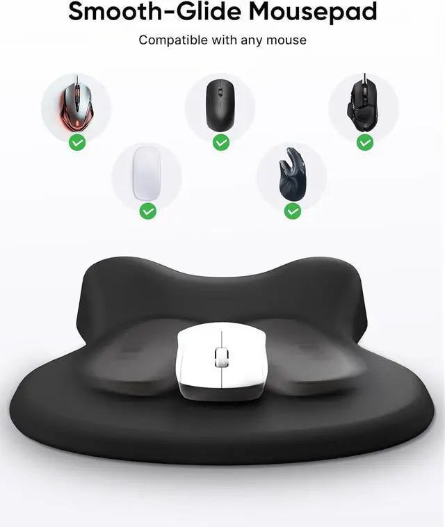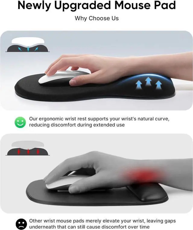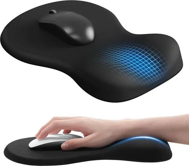 Ergonomic Mouse Pad Features a contoured wrist rest with recessed design that cradles your wrist providing optimal support points while maintaining natural alignmentEngineered for Comfort - The breathable surface prevents sweating while the ergonomic curve supports your natural wrist posture. Memory foam cushioning relieves pressure and prevents wrist fatigueSilky to Touch Precise in Motion - The milk-smooth fabric surface lets your mouse glide effortlessly while delivering flawless trackingStable on Any Surface A rigid base with honeycomb grip technology keeps the pad firmly in place without sticky residue or dust buildupHassle-Free Portability This hard mouse pad features a lightweight durable design that resists bending fits easily in laptop bags and works flawlessly even on uneven desks