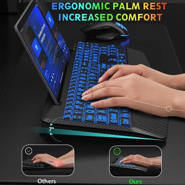The wireless keyboard comes with 7 switchable backlights and an RGB mouse that changes colors automatically. It can provide you with a different visual typing experience. The illuminated keys allow you to type easily even in a dark environment.