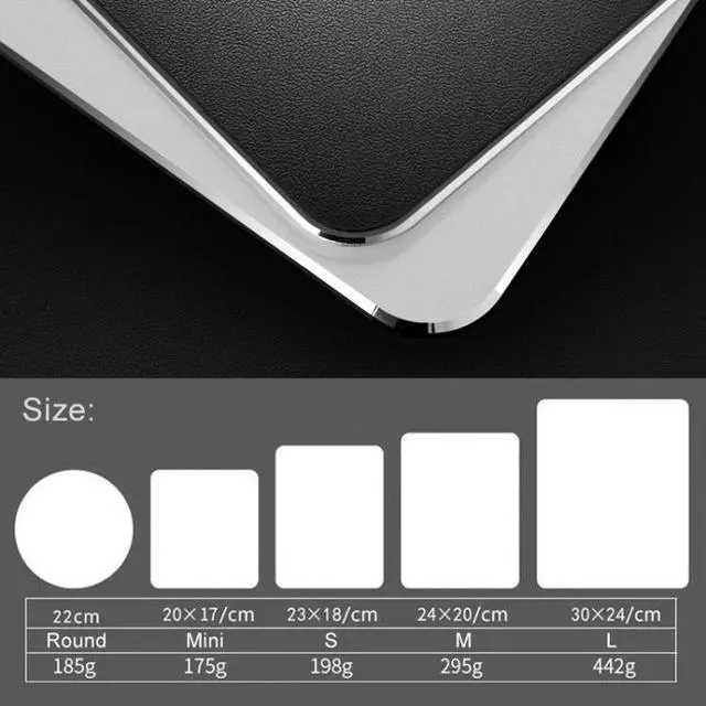 1. Material: aluminum alloy + PU leather 2. Suitable for all kinds of mice 3. Scrub is fine, smooth to use 4. Can be used on both sides 5. No dirt, easy to clean 6. Good quality and long service life 7. Dimensions: 300x240x3mm