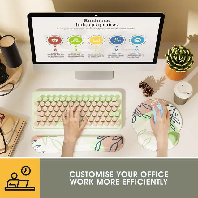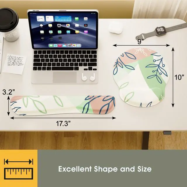 Keyboard Support & Mouse Pad Wrist Rest Set- Keyboard wrist rest( 17.3 x 3.2" ) and mouse pad with wrist rest (9x10"), which is perfect size for keyboard and mouse. Comfortably support your hands and wrists while using your desktop computer, laptop notebook. Perfect for gamers, office workers, editors designers, etc.