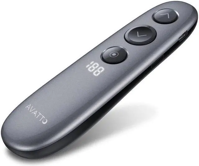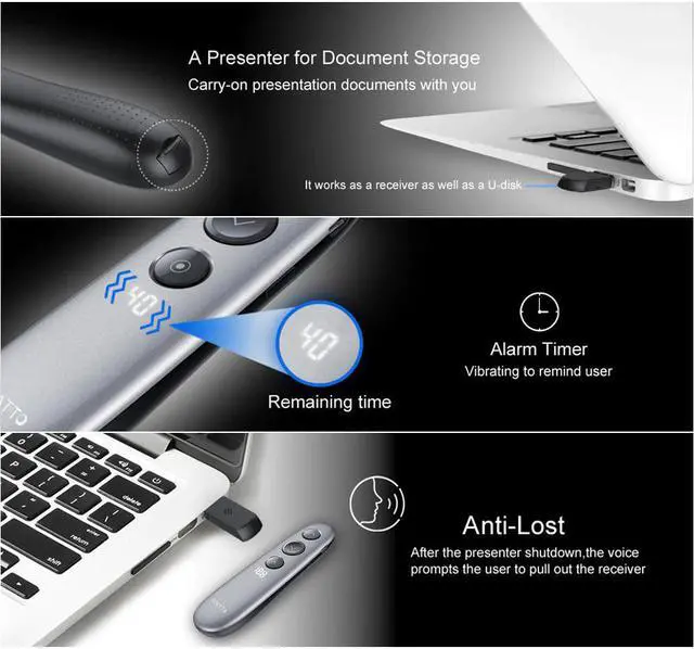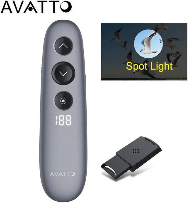 Advanced technology of spotlight, magnification, give you a superior presenting experience like never before. Presentation clicker also combines the functions of mouse-like wireless cursor control (to play video, open links etc.), anti-lost reminder, timer, switch windows, full/ black screen, page up, page down