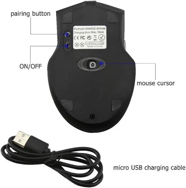 Bluetooh Wireless Mouse Rechargeable 1000DPI Silent Computer Mice USB Charging Ergonomics Gaming Mause For Laptop Desktop Size :109*70*37 mm Wireless Distance : Within 10m Power Supply Type:USB Charging Cable Work Type:Optical Name:Bluetooth Mouse Feature:Silent Mause,Ergonomic Mouse,Bluetooth Rechargeable Mouse Item:mouse bluetooth,mause bluetooth Feature:gaming mouse,mause Style:Computer Mouse,Charging Mouse Color : Black Net Weight : 92g DPI Resolution: 1000DPI Buttons: Left/Right, Scroll Wheel lace of OriginChina (Mainland) Package included: 1x Bluetooth Mouse 1x USB Charging Cable 100% brand new and high quality. Ergonomically designed, optical tracking technology, working on many different surfaces and ideal usage for home, office or game.