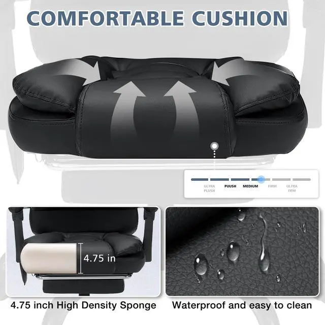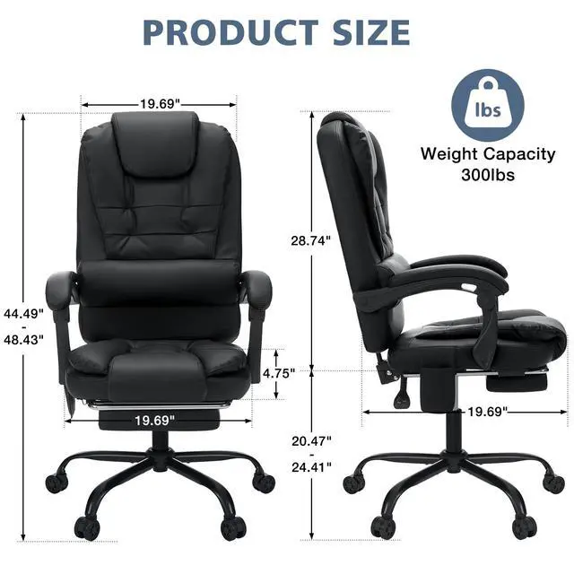 Material Faux Leather, Stainless Steel Item Weight 37.9lbs Maximum Weight Recommendation 150kg/330lbs Chair Back Dimensions 33"D x 21"W< Seat Dimensions 20"D x 18"W Seat Cushion Thickness 4 inch Back Rest Reclining Angle 90-135 degrees Overall Height (Top to Bottom) 44"-48" Seat Height (Seat to Bottom) 20"-25" Recommended Uses For Product Office, Game Room, Living room, Bedroom,Study Room Style Contemporary, Modern Back Style Solid Back Shape Rectangular Pattern Solid Age Range Adult Frame Material Alloy Steel, Polyvinyl Chloride Seat Material Type Metal, Leather Finish Type Leather Room Type Office, Game Room, Living Room, Bedroom, Study Room Desk Chair Type Task Chairs, Office Chairs, Ergonomic Chairs, Executive Chairs, Drafting Chairs, Manager's Chairs, Gaming Chairs