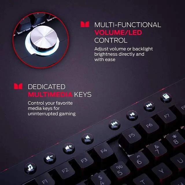 - VOLUME & LED CONTROL KNOB: This pc gaming keyboard boasts a control knob that is conveniently placed to seamlessly control LED brightness and volume so you can quickly adjust your settings without interruption. The control knob rotates smoothly to provide quick and easy commands.