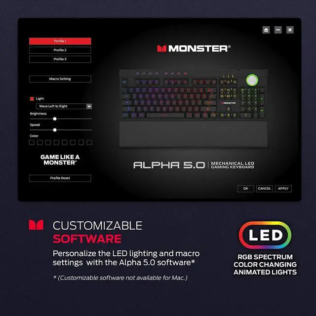 - SOFTWARE AVAILABLE: The Monster gaming mechanical keyboard comes with a dedicated software that provides the ultimate control of your gaming experience. Choose between LED lighting effects and brightness behind each key, as well as the capability to save up to 3 different profile settings for quick and convenient configuration options. Software is not compatible with Mac (macOS).