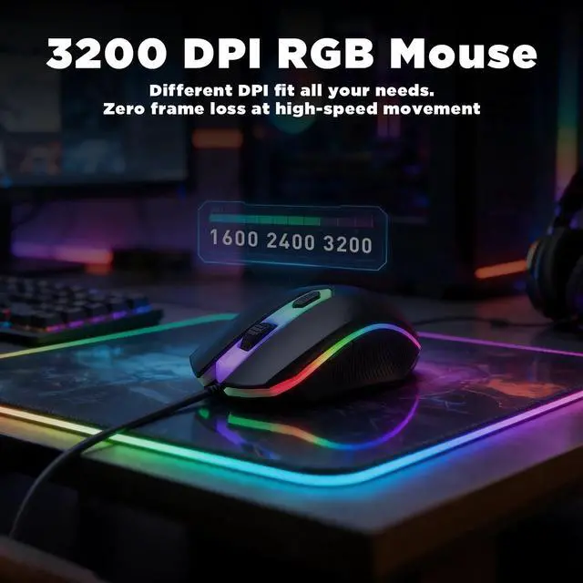 - High-Precision 3200 DPI Gaming MouseEquipped with a sensitive optical sensor offering up to 3200 DPI. The mouse includes a convenient 3-level DPI toggle (1600/2400/3200) for on-the-fly sensitivity adjustment, allowing you to seamlessly shift from precise sniper aim to swift, broad turns in an instant.