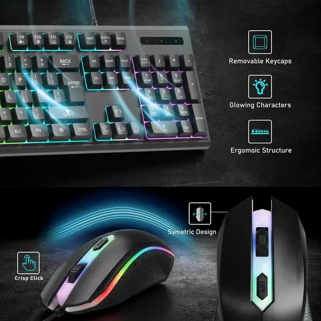 - Immersive RGB Lighting EffectsBoth the keyboard and mouse feature vibrant, customizable RGB backlighting. Create an immersive gaming atmosphere with dynamic color modes that can reflect your style or enhance your focus during gameplay.