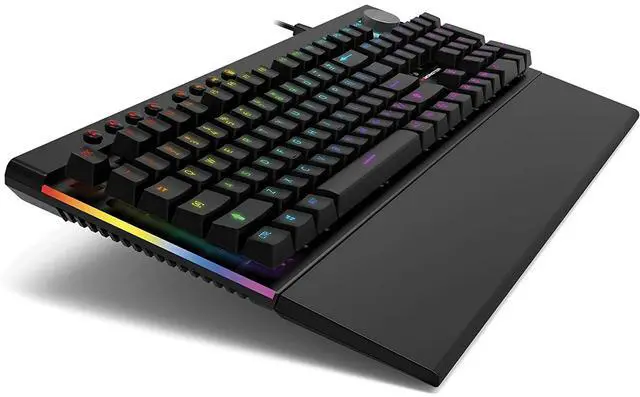Exceptional performance with every keystroke, Monster stunning wired mechanical keyboard sets a new standard of performance gaming right at your fingertips. Actuation keystrokes so precise and lightning fast that your gaming skills will be on a whole new level of competition. This ergonomic gaming keyboard is designed with our intuitive anti-ghosting technology to prevent keystroke loss during intense gaming, you never have to worry about your shortcuts not registering. Craft your personalized gaming setup with the downloadable software to customize LED lighting, including the customization of each individual key, and create custom macros you have complete control! The built-in volume and LED control knob is conveniently placed on the upper right side of the keyboard so you can quickly control the LED brightness and volume without interrupting the in-game action. Our RGB mechanic keyboard is designed to provide hours of comfort, the ergonomic magnetic palm rest gives extra support.
