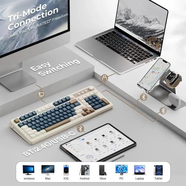 The DIXSG S99 Light-Up Keyboard combines retro style with modern performance, offering triple-mode connectivity via Bluetooth 5.0, 2.4GHz wireless, and USB-C wired for seamless switching across up to five devices. Designed for both work and play, it features full-key macro programmability, a dual-mode rotary knob, and three customizable shortcut keys (M1/M2/M3) to streamline your workflow and gaming commands. With 16.8 million RGB colors and 16 preset lighting effects, you can personalize your setup and create an immersive atmosphere. The 96% layout includes a numeric keypad for familiar functionality, while the foldable two-stage stand ensures ergonomic comfort. Backed by a 48-month warranty and compatible with Windows, macOS, Android, and iOS, the AULA S99 is a stylish and reliable choice for any setup. Note: This is a membrane keyboard and does not support hot-swapping.