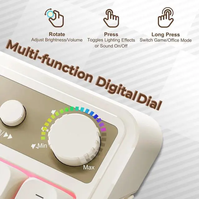 3. Vibrant RGB Keyboard: The led keyboard comes with 16.8 million RGB color and 16 preset light effects add more fun to your desktop. With the knob or FN+ key combination, you can freely adjust the brightness and speed of the cute keyboard's lights to create an exclusive atmosphere. With the macro software, you can also customize the lights to make your silent backlit keyboard truly unique and enjoy an immersive visual experience whether you are working or gaming