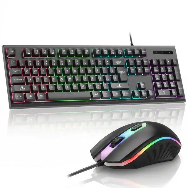 Unleash your gaming passion with this RGB wired keyboard and mouse combo. Designed for gamers, it features a vibrant backlit 60% compact keyboard that saves space, and a high-precision mouse with 3-speed DPI tuning (up to 3200) for versatile control. Lightweight and perfectly sized, it ensures comfort during long sessions. Plug and play for instant setup on PC and laptops. Enjoy a seamless, immersive gaming experience right out of the box.