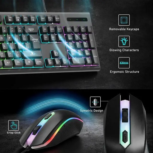 - Immersive RGB Lighting EffectsBoth the keyboard and mouse feature vibrant, customizable RGB backlighting. Create an immersive gaming atmosphere with dynamic color modes that can reflect your style or enhance your focus during gameplay.