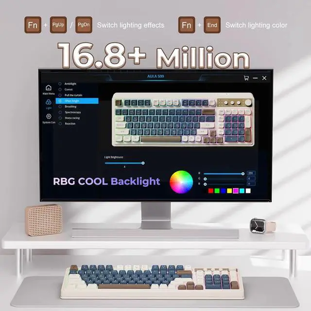 The AULA S99 Light-Up Keyboard combines retro style with modern performance, offering triple-mode connectivity via Bluetooth 5.0, 2.4GHz wireless, and USB-C wired for seamless switching across up to five devices. Designed for both work and play, it features full-key macro programmability, a dual-mode rotary knob, and three customizable shortcut keys (M1/M2/M3) to streamline your workflow and gaming commands. With 16.8 million RGB colors and 16 preset lighting effects, you can personalize your setup and create an immersive atmosphere. The 96% layout includes a numeric keypad for familiar functionality, while the foldable two-stage stand ensures ergonomic comfort. Backed by a 48-month warranty and compatible with Windows, macOS, Android, and iOS, the AULA S99 is a stylish and reliable choice for any setup. Note: This is a membrane keyboard and does not support hot-swapping.