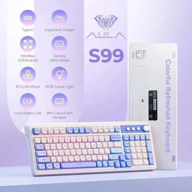 The AULA S99 Light-Up Keyboard combines retro style with modern performance, offering triple-mode connectivity via Bluetooth 5.0, 2.4GHz wireless, and USB-C wired for seamless switching across up to five devices. Designed for both work and play, it features full-key macro programmability, a dual-mode rotary knob, and three customizable shortcut keys (M1/M2/M3) to streamline your workflow and gaming commands. With 16.8 million RGB colors and 16 preset lighting effects, you can personalize your setup and create an immersive atmosphere. The 96% layout includes a numeric keypad for familiar functionality, while the foldable two-stage stand ensures ergonomic comfort. Backed by a 48-month warranty and compatible with Windows, macOS, Android, and iOS, the AULA S99 is a stylish and reliable choice for any setup. Note: This is a membrane keyboard and does not support hot-swapping.