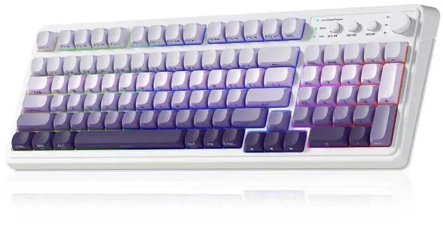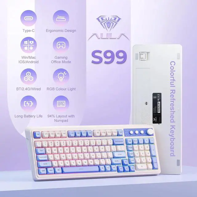 AULA S99-Key Tri-Mode Gaming Keyboard, Bluetooth/2.4GHz/USB-C, RGB Backlit, Numpad, Media Knob, Mechanical Feel, Gradient Purple