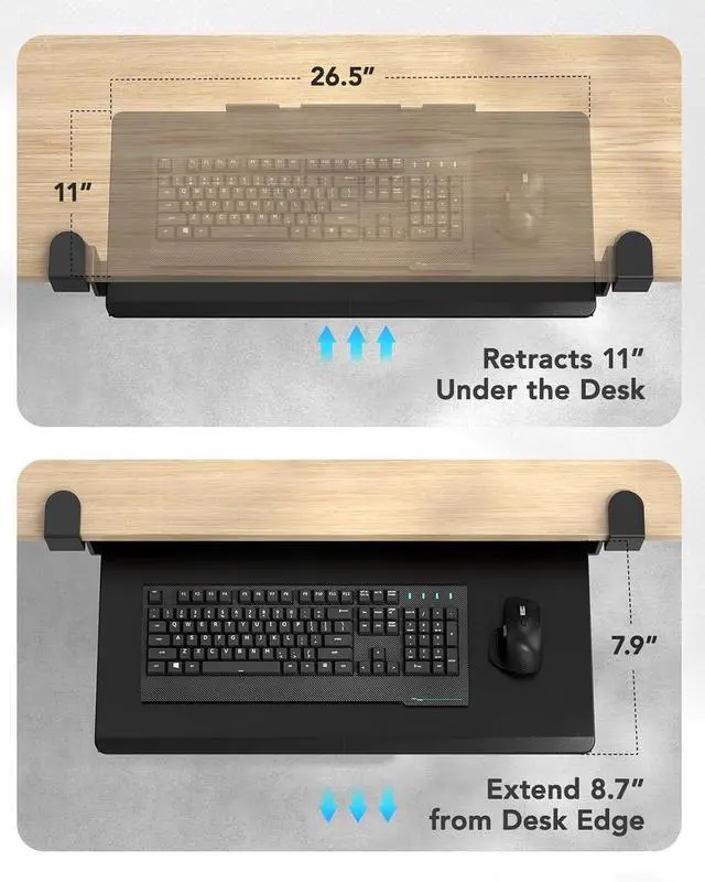 Save Desk Space: This keyboard tray measures 26.5 W x 11.8 D and supports up to 11 lbs. Keep your keyboard, mouse, and small accessories neatly tucked below the desktop surface. Elevate the look of your desk while creating a more organized and efficient workspace.