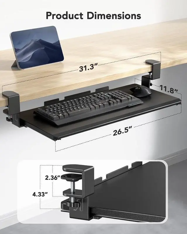 Easy Installation: Detailed instructions, mounting hardware, and adjustable C-clamps are included with the keyboard tray for hassle-free installation. The keyboard tray under desk requires a minimum desktop width of at least 31.3, a desktop thickness between 0.5" and 1.49". Please confirm the dimensions of your desk before purchase.