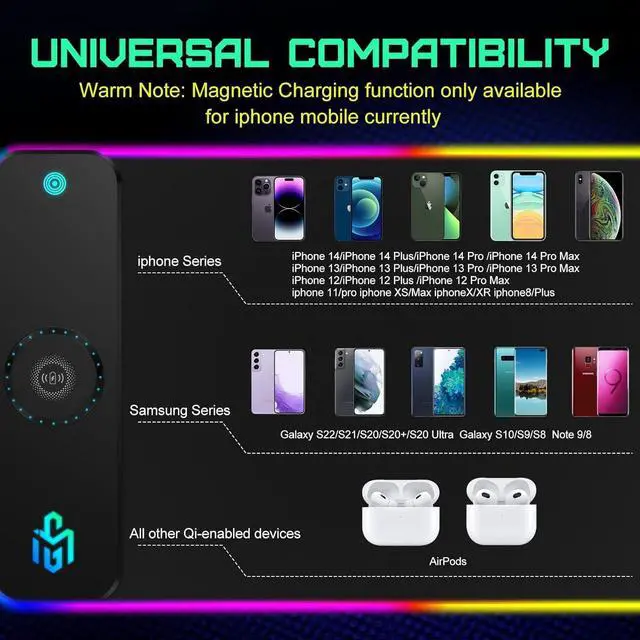 Built-in Magnetic Wireless Charging for iPhone SeriesSupport such as Phone 12/iPhone 12 mini/iPhone 12 Pro/iPhone 12 Pro Max, iPhone 13/iPhone 13 mini/iPhone 13 Pro/iPhone 13 Pro Max, iPhone 14/iPhone 14 Pro/iPhone 14 Pro Max/iPhone 14 Plus. Automatic alignment charging after placing the iphone mobile on the wireless charging plate.