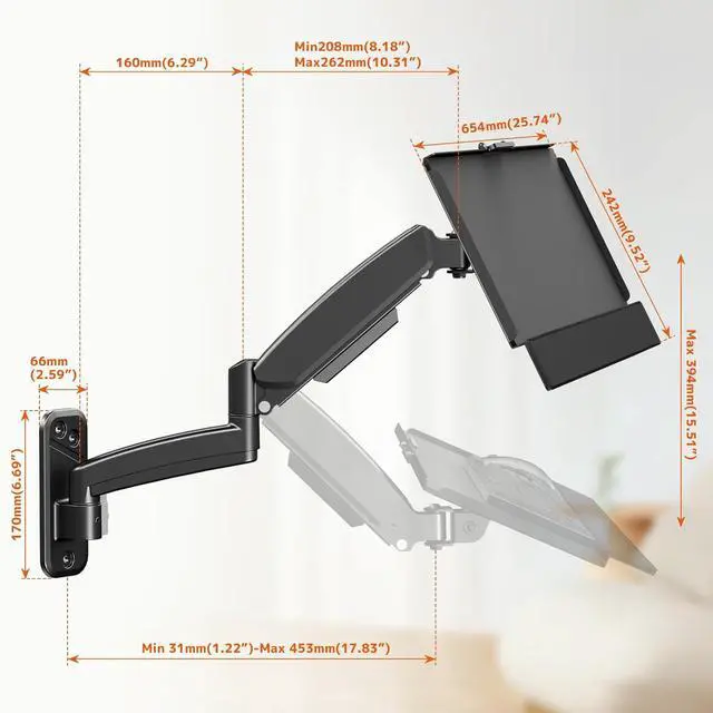 Mechanical Spring Support:The smooth keyboard tray is supported by a powerful mechanical spring arm, allowing you to effortlessly raise or lower the tray by up to 15.5 inches. It supports a weight capacity of up to 19.8 lbs.