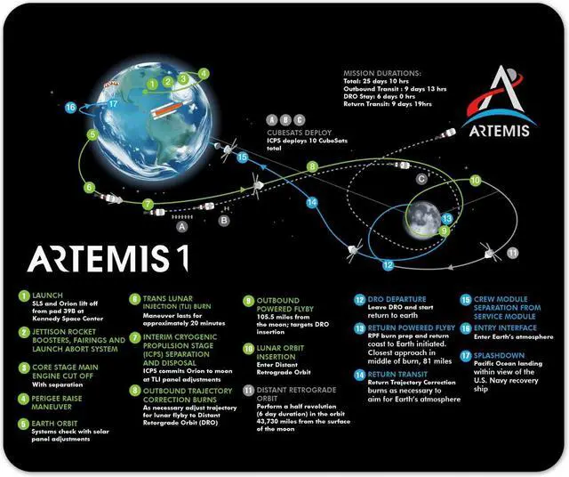Introducing the NASA Artemis1 Flight Path Mouse Pad 1/8 Thick, your detailed guide to the Artemis 1 unmanned mission to the moon. As a true space enthusiast, this mouse pad is the perfect addition to your collection. Get ready to embark on a journey through the cosmos with this exceptional product.