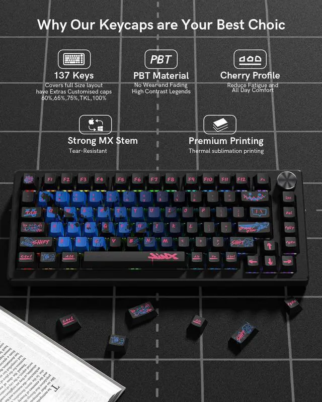 The Typehaven x Womier 137 key keycap set, Featuring Cherry profile, durable PBT material, and dye-sublimated legends, this set offers a unique and timeless upgrade for any mechanical keyboard.