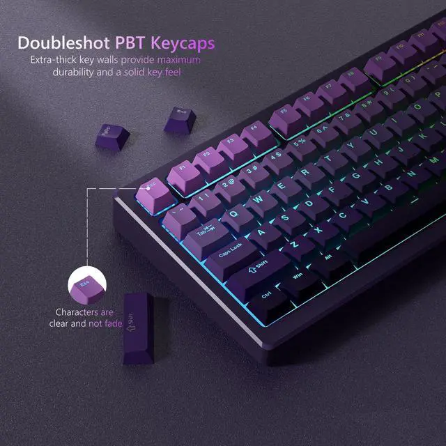 PBT is abrasion-resistant, heat-resistant, dirt-resistant, non-colour-flaking, and can be cleaned with water, which has a durable surface and a comfortable tactile feel. Double shot PBT keycaps gives you a durable finish and no shiny grime with continuous use