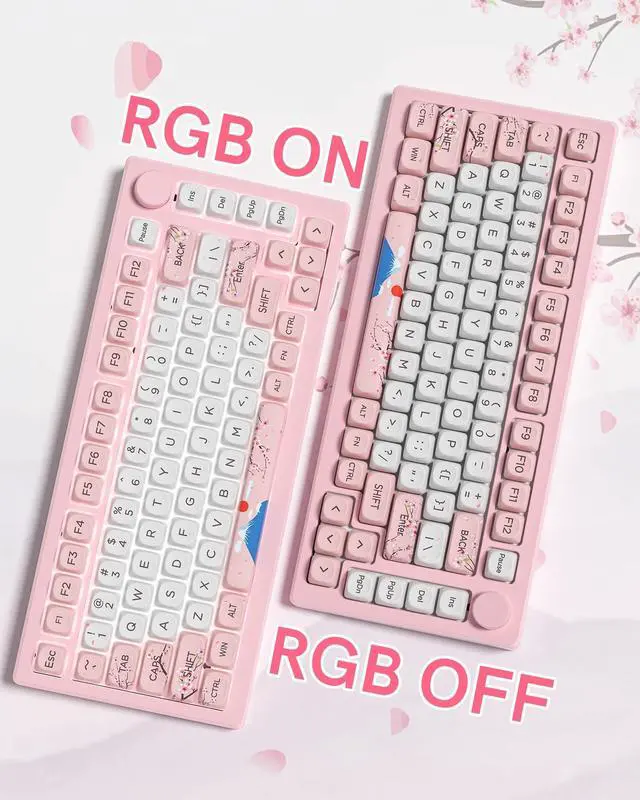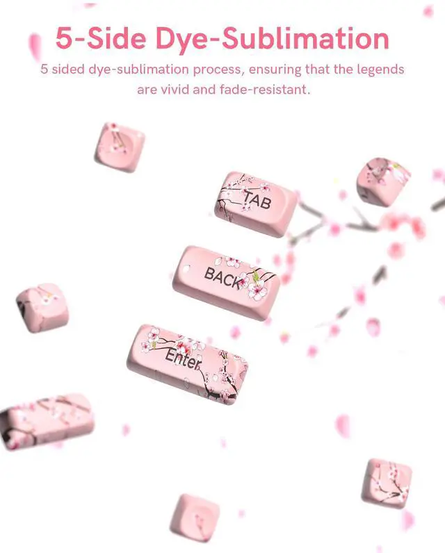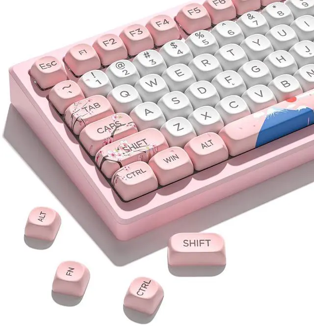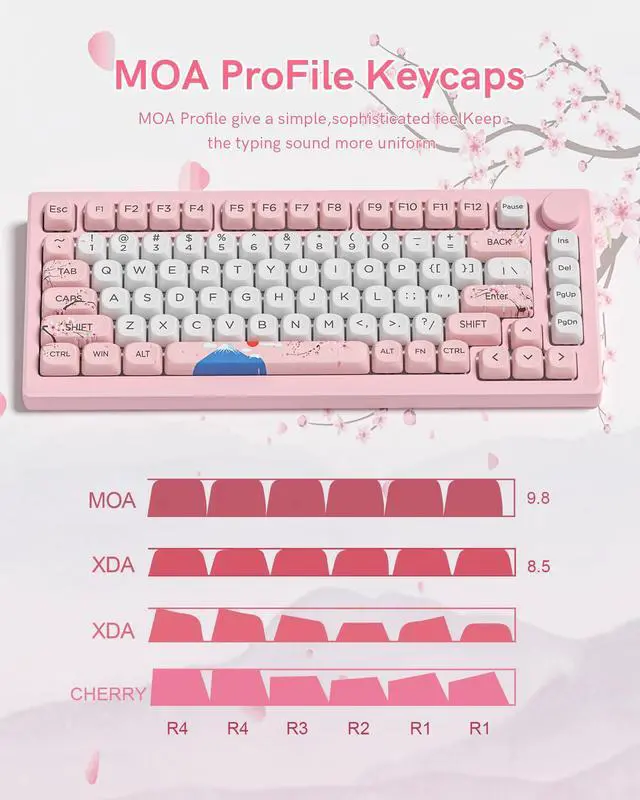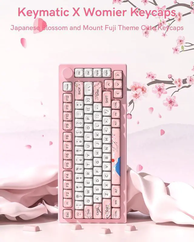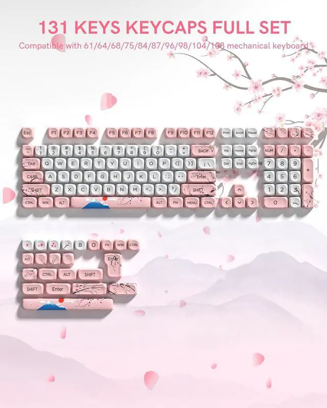 Keymatic Cute Keycaps is a charming custom keycaps set featuring a Japanese cherry blossom and Mount Fuji theme. These are premium PBT Keycaps, offering excellent durability and a crisp, non-greasy tactile feel. The set includes 131 keyboard keycaps crafted in the ergonomic MOA Profile for comfortable use. It uses 5 side dye sub technology, ensuring vivid theme patterns that wont fade from any angle. Plus, these Cute Keycaps are widely compatible with 61/64/68/84/87/100/104/108 retro gaming mechanical keyboards. Theyre perfect for gamers and keyboard lovers wanting a delicate, thematic setup. This custom keycaps set have 3 color options are available.Each Keycap Set blends style and functionality to elevate your typing and gaming experience.