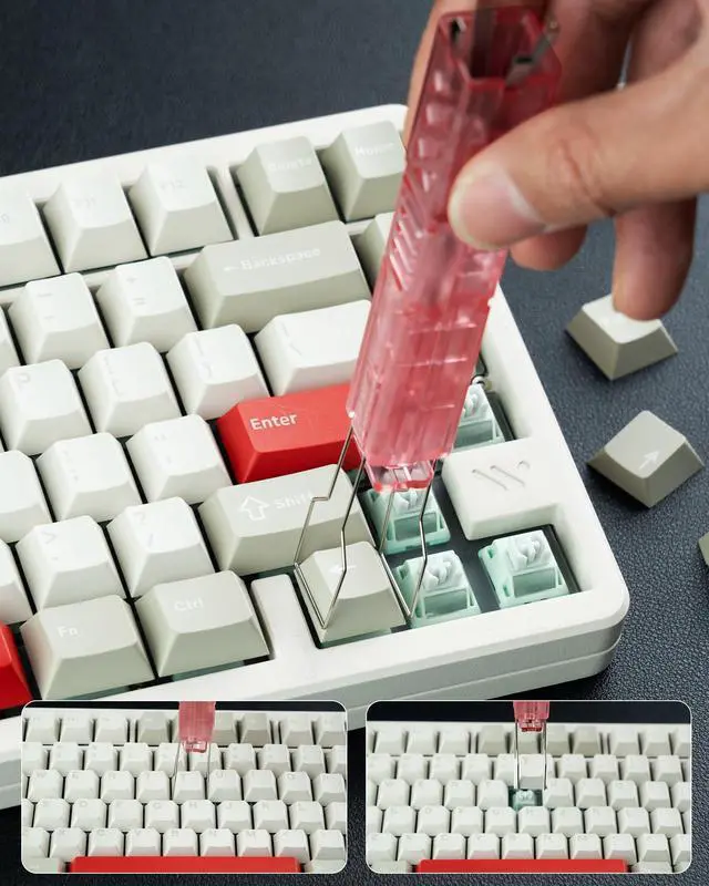 As shown, control with your pinky and hypothenar. The wires are slightly wider than a 1U keycap, fitting perfectly into gaps. A light grip hooks the keycap for easy removal. The wires are easy adjustable for 1.25U, 2U, and other keycap sizes.