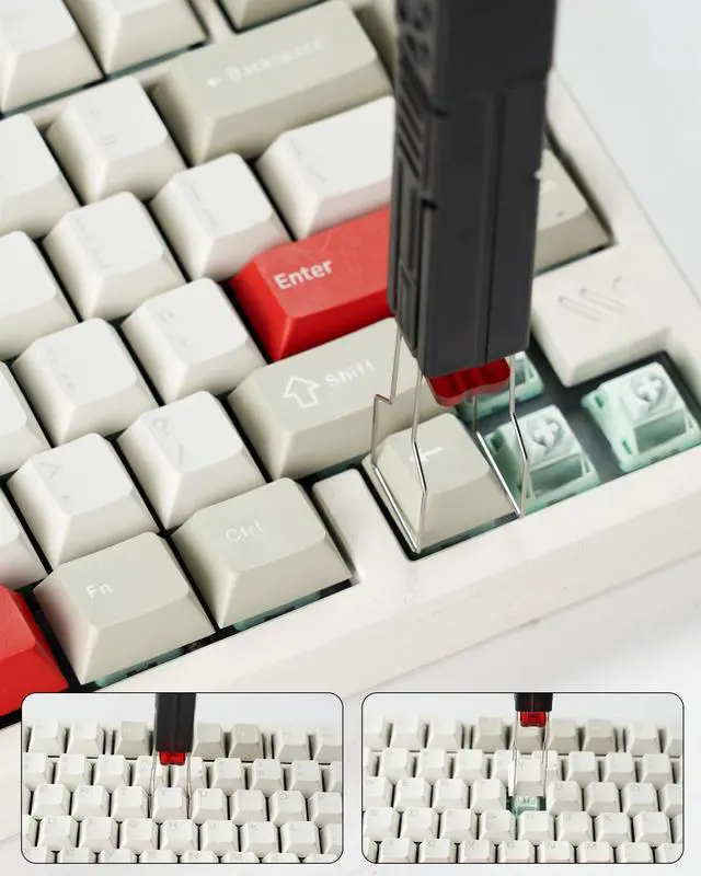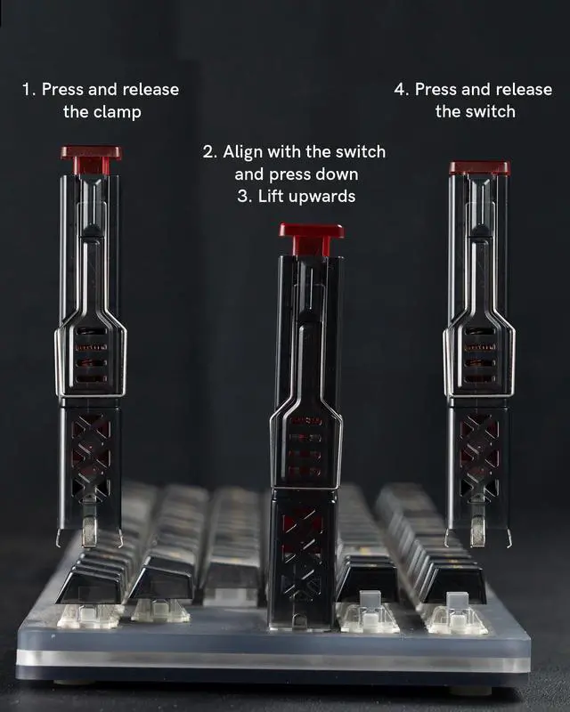 As shown, control with your pinky and hypothenar. The wires are slightly wider than a 1U keycap, fitting perfectly into gaps. A light grip hooks the keycap for easy removal. The wires are easy adjustable for 1.25U, 2U, and other keycap sizes.