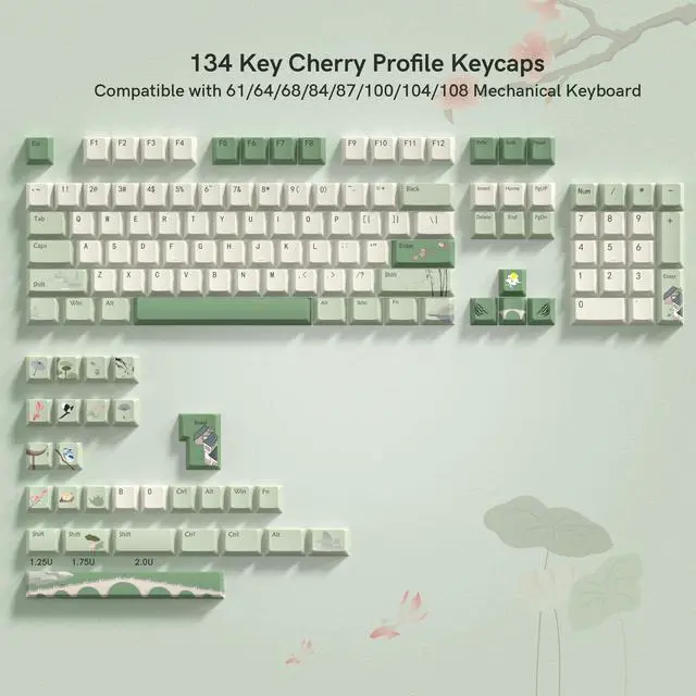 This keycap set has 134 keycaps.including 104 standard keys and 30 modifiers keys, compatible with most ASIN US and UK layout 61/64/68/84/87/96/98/100/104/108 mechanical keyboards.This set of key caps contains two space keys: 6.25U, 7U. Five Shift: 1.25 U ,1.75 U, 2 U, 2.25U, 2,75 U. Suitable for Alice keyboard.